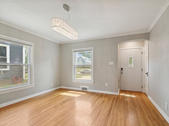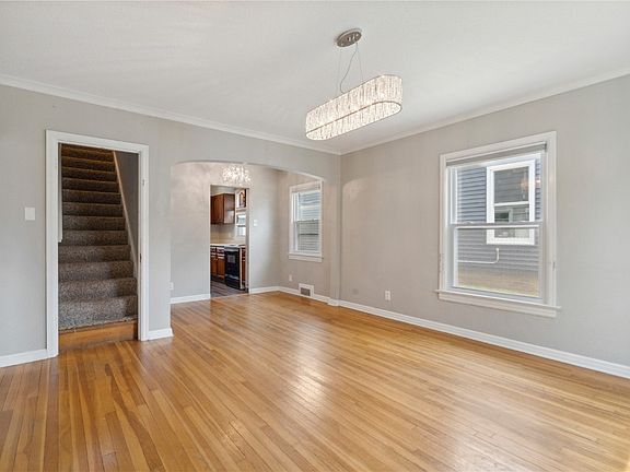 The floor plan seamlessly connects to the dining area and a beautifully made over kitchen, complete with modern cabinetry, new appliances, and sleek countertops.