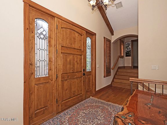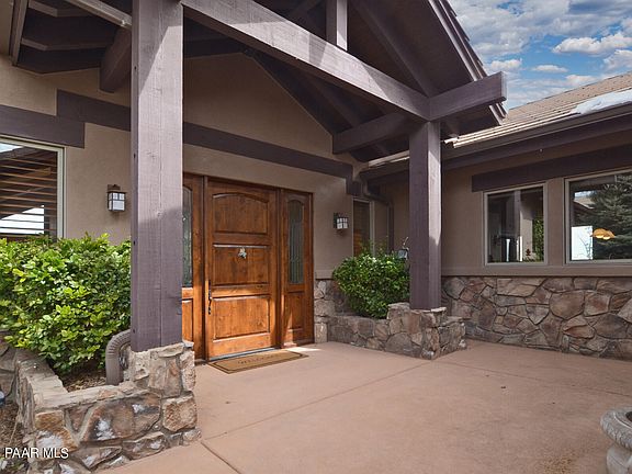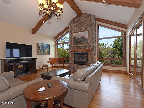 PRICE REFLECTS APPRAISAL - 100 MILE VIEWS - Expansive Living/Great Room with vaulted beamed ceiling. PRIMARY SUITE ON MAIN LEVEL with guest quarters and outdoor patio on lower level - 3 bedrooms, 3.5 baths, gourmet kitchen, large office/ formal dining room/den, custom wood Kitchen Island with informal dining, wrap around view decks plus private deck off master suite. Two guest suites both with outdoor access Views of Flagstaff, Thumb Butte and Bradshaw Mountains, City lights. Mountain Lodge details include hardwood, stone accents, and 4 fireplaces. Upper and lower-level entertaining decks. New Hunter Douglas window coverings. Upgraded finishes throughout. SPECTACULAR VIEWS - MAKE OFFER