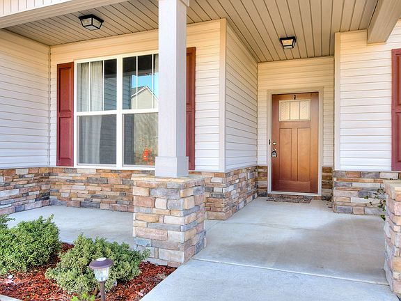 . This New Ranch features a split floor plan, with 4 Bedrooms and 2 full baths. Open concept with a gorgeous kitchen with white cabinets , under cabinet lighting , granite counter tops, tiled backsplash and stainless steel appliances( including french door refrigerator ) opens up to the Family Room and Breakfast Area. This home offers a foyer, formal dinning Room and has plenty of windows for plenty of natural lighting and 2 inch faux wood blinds . Main public areas have a beautiful LVP flooring . Covered front porch on front and back. Backyard has privacy fenced in area, and lot extends far beyond the back fence line and is useable, so make sure to check that out ! . This home also backs up to a conservation area greenspace., HERS Energy Efficient Home with Radiant Barrier Roofing!!! Grove Landing is a wonderful place to live, offering a Club House, Junior Olympic Pool, Fishing Pond and 2 play grounds. Washer and Dryer also conveys