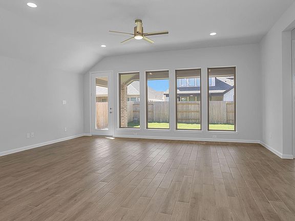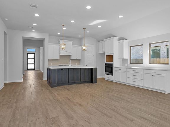 READY FOR MOVE IN!! Home office with French doors set at entry with 12-foot ceiling. Extended entry leads to open kitchen, dining area and family room. Kitchen features corner walk-in pantry, 5-burner gas cooktop, generous counter space and island with built-in seating space. Dining area flows into family room with wall of windows. Primary suite includes double-door entry to primary bath with dual vanities, garden tub, separate glass-enclosed shower and two large walk-in closets. A guest suite with private bath adds to this spacious one-story home. Extended covered backyard patio and 6-zone sprinkler system. Mud room off two-car garage.