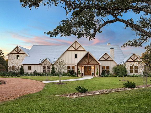 Tucked away on 12 private acres just minutes from Round Top Square, this 6,586 sq. ft. custom estate built in 2024 offers the perfect blend of luxury and tranquility. Featuring 5 bedrooms and 5 baths, including two primary suites and two en-suite guest rooms, this home is designed for comfort and privacy. French doors open to light-filled interiors with soaring beamed ceilings and a dramatic floor-to-ceiling limestone fireplace. The chef's kitchen boasts Thermador appliances and a large island, complemented by a formal dining room with wine room and a library with fireplace. Additional highlights include an oversized 3-car air-conditioned garage with upstairs living quarters and full bath, expansive covered back porch with stone fireplace, and hallways designed as art galleries. Ideal for entertaining or peaceful living, this ag-exempt property is a rare find, so close to Round Top.