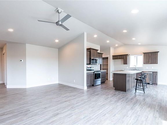 Newly completed home has vaulted ceiling in entry, living, dining & kitchen great room. Main floor also has hand textured walls, 3 bdrms, 2 baths, laundry & large kitchen with SS appliances. Master suite has tray ceiling, double vanity, walkin closet & ceiling fan. Bedrooms have carpet. Great room, entry & laundry have luxury vinyl tile. Baths have vinyl flooring. Lower level is unfinished with perimeter framed & insulated with egress windows for additional 3 bdrms, full bath & family room. 930 sq ftOversized 3 car garage has 28' deep double bay & openers. Exterior is maintenance free steel siding with brick accents. Large back patio in big backyard with 6' white vinyl privacy fence. Popular public Lake Hills Golf Course is within walking distance. Near great schools. Close to airport & downtown.