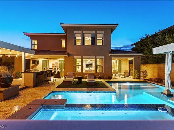 Discover luxury living in this former model home in the highly desirable Inspirada community. This residence offers 2 primary bedrooms, a Chef's kitchen with modern appliances, an expansive walk-in pantry, wine refrigerator, an open floor plan, and advanced tech features like Sonos surround sound and security cameras—all accessible via an app. Enjoy outdoor entertaining with a resort like custom pool and spa, covered patios, BBQ area, and outdoor TV. Move in effortlessly; furnishings are all available. Stunning mountain views, private rear yard, and so much more! Explore vibrant neighborhood parks, playgrounds, sports courts, weekly Farmers Markets, and a community delicatessen. The location is absolutely ideal, Harry Reid international Airport and Henderson executive Airport are nearby and very convenient.  Enjoy quality shopping and dining options, great schools, and a lifestyle like no other. Enjoy more of life with no state income tax!