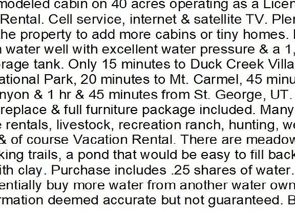 Newly remodeled cabin on 40 acres operating as a Licensed Vacation Rental. Cell service, internet & satellite TV. Plenty of room on the property to add more cabins or tiny homes. Brand new fresh water Well w/ excellent water pressure & a 1,700 gallon storage tank. Only 15 min's to Duck Creek Village, 1/2 hr to Zion National Park. 20 min's to Mt. Carmel. 45 min's to Bryce Canyon, & 1 hr & 45 -->