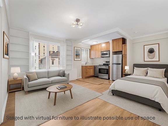 Wet and dry separate areas in the bathroom with a functional closet and storage space. Laundry in bldg. Onsite manager/handyman. Open kitchen. Wood floor throughout and tile floors in the kitchen and bathroom. A/C.