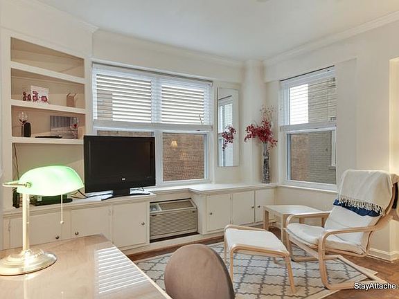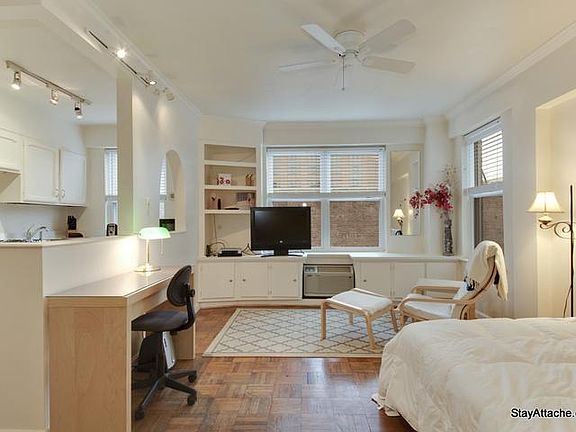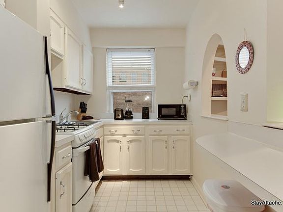 This fully-furnished studio, 1 bathroom condo is on the fourth floor of a 5-story building on the convergence of Dupont Circle and the West End. The sunny unit features hardwood floors, built-in storage, a charming curved pass-through to the kitchen, a gas stove and microwave in the kitchen, a tub and shower in the bath, a queen-sized bed, a card-operated laundry in the building, and in-wall air conditioning. The building boosts a shared roof deck with great views of downtown DC. Restaurants, a Whole Foods Grocery Store, a Trader Joes, and shops are just blocks away. The Dupont Circle (red line) Metro Station is an easy 7-minute walk away, and the Foggy Bottom (blue, orange, and silver lines) Metro Station is just over 10 minutes away. Walk score: 95, Transit score: 92, Bike score: 94.