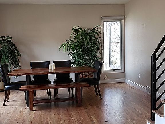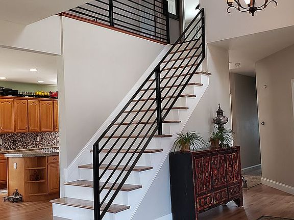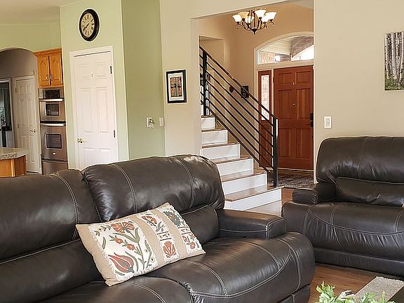 Impressive six bedroom home situated on almost half an acre. Inside you are greeted by a grand foyer, custom built staircase, soaring vaulted ceilings, and large picture windows. Hardwood floors throughout the main level lead you to numerous gathering areas, including formal living room, private office, separate dining room, eat-in kitchen w/ beautiful Corian island and countertops and ample cabinet space. Sliding glass doors off the main level leads to a quiet patio that is an extension of the oversized backyard retreat complete with a fully fenced yard, hot tub and in-ground trampoline, perfect for entertaining! Enjoy the beautiful snow capped mountain views from the upstairs master suite balcony. This private, primary bedroom also features a luxury 5-piece bathroom and sizable walk-in closet. Three additional bedrooms plus a full bathroom with dual vanity sinks, completes the upstairs level. A fully finished basement includes large great room, rec room, two bedrooms, and storage.