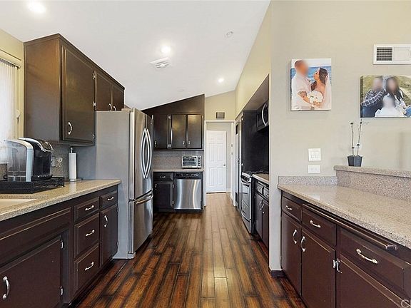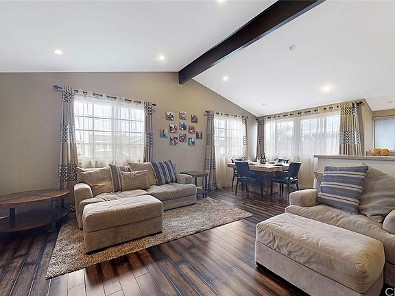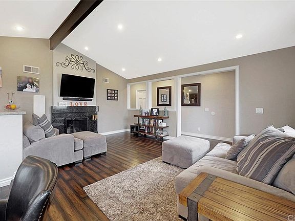 Wonderful Anaheim home features a great open floor plan. The living room features high beam ceilings with recessed lighting throughout and a cozy fireplace. Open kitchen features tastefully updated cabinets with granite counter tops. Large area for formal eating. This home features 3 functional bedrooms with a possible 4th bedroom currently being used as a TV room/den with beautiful built-ins. Modern wood flooring throughout. The Master bedroom is large with a renovated master bathroom with dual vessel sinks. Enjoy your walk in custom shower! A second bathroom features a full tub/shower. Enjoy the convenience of full access to your 2 car garage. The guest bedrooms are also great sizes and include extra built-ins for storage. Very nicely landscaped and custom outdoor fire pit area for your guests to enjoy. Great location in Anaheim near shopping and freeways! This home will not last!