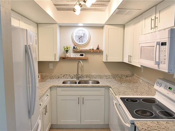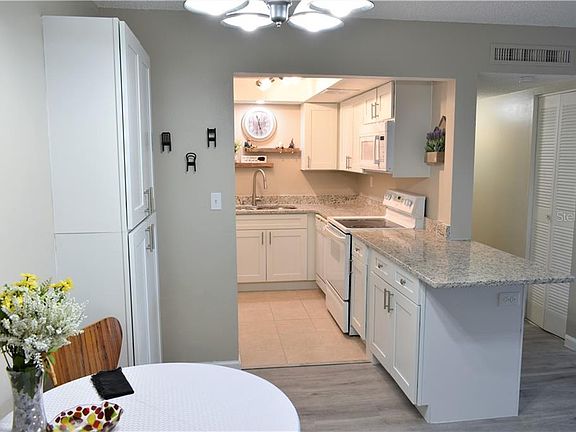 Quiet, ground floor unit. Completely refurbished throughout. Move-In Ready. View of swimming pool. New kitchen cabinets, granite countertops, new flooring, new bathroom vanity with granite counter. Living room features an electric fireplace. Lovely lanai with seating for four. New A/C and water heater. Berkley House has a security entrance Lobby, an onsite laundry facility, 2 grilling areas, shuffleboard, tennis courts, activity/social room, 2 heated pools and an onsite management office. Close to town, shopping, restaurants, and medical providers. MULTIPLE OFFERS, HIGHEST AND BEST OFFERS BY 6:00 PM 2/18/21
