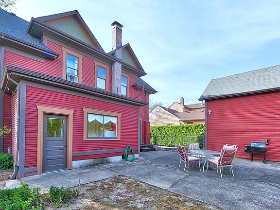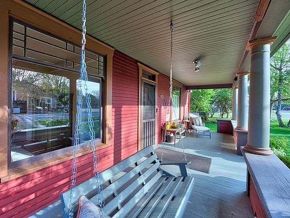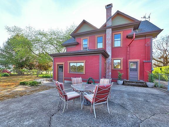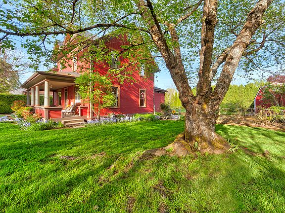 Charming home on large sunny corner lot with mature landscaping, berry & veggie gardens and private fenced back yard. Steps away from park, bakery, pub, wine bar and antique shops. Large windows, fir floors, period woodwork and hardware throughout. Formal dining room and large living room off of the white kitchen. Mt. Hood views, 3 bedrooms, walk-in closets, full bath with subway tile. Large front porch and back patio. Two-story carriage house and shop/tool shed.