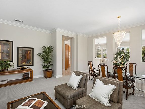 This lovely single-story home is located in the Palmia guard gated senior community. Featuring 2 bedroom, 2 baths, 1755 sq. ft. with plantation shutters throughout, wide baseboards & some crown molding. It has been freshly painted with new carpeting. The formal entry opens into a large living room and formal dining room. A nice size eat-in kitchen is adjacent to a family room with a fireplace, and direct access to the EXTRA-large back yard. It features a wonderful master bedroom suite. The master bathroom has a double sink vanity, large stall shower and a walk-in closet. The guest bedroom and bath are at the other end of the house. The home is located at the end of a quiet cul-de-sac. The back yard is exceptionally large yet low maintenance. Palmia Senior Community is second to none with an 18-hole putting green, tennis, paddle tennis, pickle ball, bocce, pool & spa, fitness center, billiards, library, card room, many clubs, parties and much more. You also have access to Lake Mission Viejo which has beautiful sandy beaches, boating, picnic area, and fabulous summer concretes.