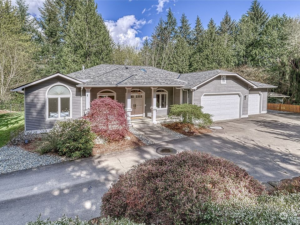 Nestled amidst evergreens, down a quiet lane, sits this dreamy Poulsbo one story home on acreage. Be amazed! Outstanding care & features: BRAND NEW ROOF. Admire its open floor plan & sophisticated design. Warm hardwoods gleam in natural light. Incomparable kitchen! French doors to a tall covered deck, all set up for a hot tub + a door into the Primary suite, which is privately situated on its own end of the home. Pamper yourself in the jetted tub & glass block shower. Giant W/I closet. Seasonally comfortable w A/C + a stylish FP. Grill on the patio adjacent to the pond & waterfall. Roast s'mores at your fire pit. Garden in the sun while loved ones play in the fenced-in yard. Level RV parking pad w power. 3 car garage. Pre-inspected & ready!
