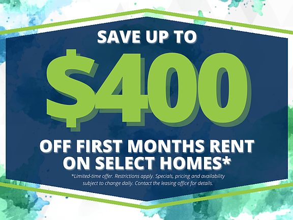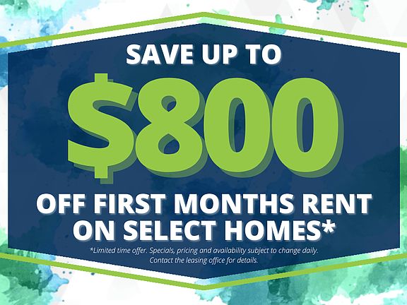 - Special offer! Get up to $800 off first months rent on select homes! *Restrictions apply. Specials, pricing and availability subject to change daily. Contact the leasing office for details. -