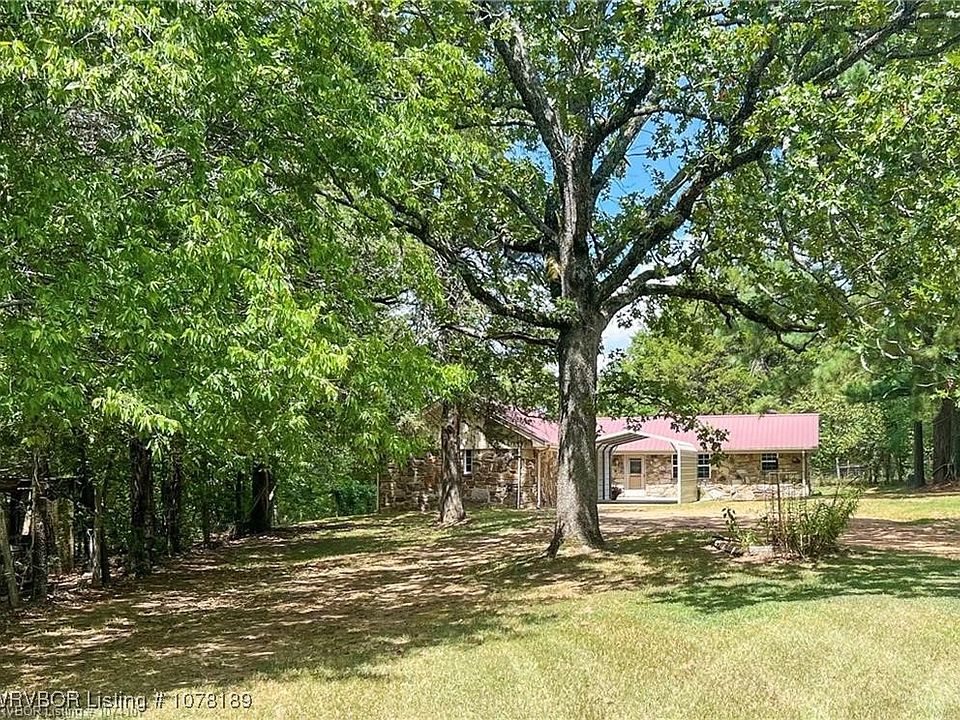 Beautiful and peaceful property: This quaint rock home nestled amongst tall pine and oak trees offers quiet privacy in the country! Both wooded and cleared, the 6.55+/- acres this home is located on has fun trails to walk plus a wet weather stream! There are 2 out buildings, 1 small barn, 1 pole shed, and a well to water with. The property is fenced and has a carport with concrete slab. Inside the house there are 3 bedrooms, 2 bathrooms, a rock wood burning fireplace. The house has been freshly painted throughout giving it a freshly new and updated feel. New kitchen remodel including painted cabinetry, new counter and backsplash and brand new stainless steels appliances that will all convey (even the refrigerator)! There is an eat-in kitchen area. The washer and dryer will convey as well. This house is move in ready and the property is just waiting for the right owner to make it HOME!
