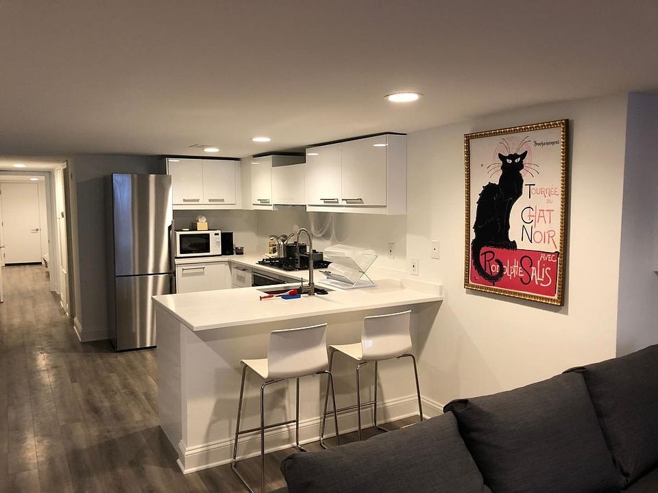 Located at the heart of the West End of Washington: 5-minute walk to Dupont Circle and 10-minute walk to Georgetown, and red, blue, orange and silver metro lines. Lots of restaurants and shops nearby. Newly renovated large one-bedroom English basement apartment (900 sqft) with a queen bed in the bedroom and a comfortable queen sofa bed in the living room. Brand new kitchen and bathroom. Owner pays for water and WiFi, renter pays for electricity and gas ($40-70/month). Deposit one month rent. One year (or more) lease preferred, but can consider 9 months. Parking in the back alley is available for an additional $150/month.