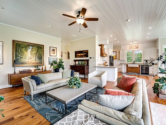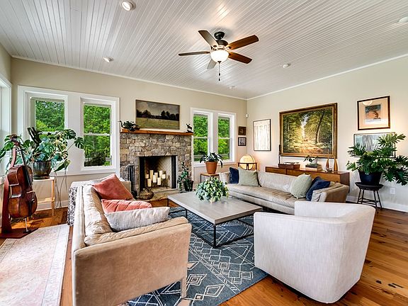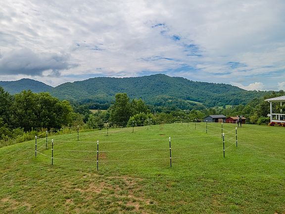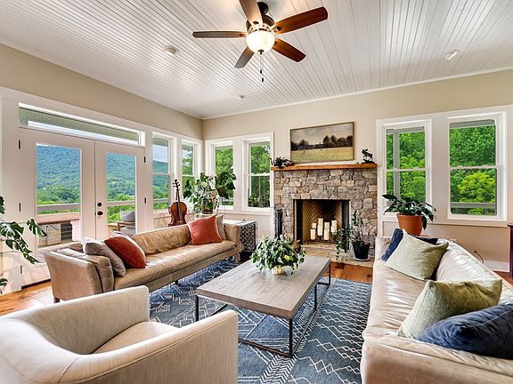 Nestled amidst the majestic Cowee Mountains, this luxurious farmhouse on 11.01 acres is situated in one of Franklin's most picturesque areas. The unrestricted rolling pastureland and wooded area provide ample privacy and space, perfect for raising farm animals and enjoying a rural lifestyle. The expansive porches on either side of the house invite you to relax and soak in the natural beauty. Step inside through the foyer into the charming, modern kitchen and dining area. The kitchen blends farmhouse charm with modern convenience, featuring granite countertops, stainless steel appliances, a farmhouse sink, a microwave, and a convection oven. Gather around the dining table to enjoy fresh vegetables from your garden with family and guests. The great room, with its high tongue-and-groove ceiling, showcases a stunning stone fireplace and large windows that flood the space with natural light. The primary suite, conveniently located just off the great room, offers a serene retreat. Upstairs, a private suite with its own bathroom provides comfort and privacy for guests. The lower level boasts a spacious family/recreation room, an additional bedroom and bath, a private patio, and a large