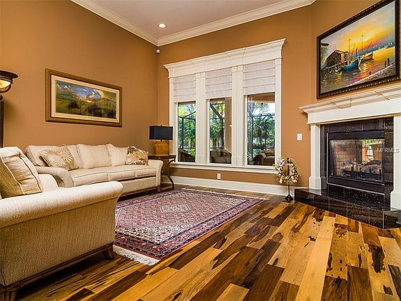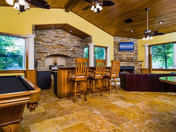 Elegance abounds in this One-Of-A-Kind Hulbert Home located on a lushly landscaped half-acre in an exclusive SE Gated Community. Traditional features with stone accents & grand foyer entry with custom leaded glass doors. Formal living & dining rooms boast 12 to 14 ft ceilings, pecan wood floors, crown molding, fireplace & double tray ceiling. Enter arched doorways to butler's pantry with wine cooler open to living room. The 850 sq ft Billiards/Recreation room (33 x 19) has space for the pool table, kitchen with Traeger grill, sitting area with stone fireplace, exercise equipment and gaming table. Vaulted wood ceiling, travertine floors and stone accents add to the charm of this wonderful space. Relax in the sitting area with gas fireplace with stone hearth and TV above. Traeger (high-end) wood pellet grill with hood built into an alcove surrounded by custom stonework. Large island with prep sink, 2 refrigerators and plenty of bar seating. 2 sets of triple sliding doors pocket into the walls for open entertaining on the large pavered lanai with plenty of seating overlooking the solar heated lagoon style pool with unique water fountain features. The Upstairs Media room is equipped with theater seating and projector screen. Wonderful open kitchen features a 7 ft center island with prep sink. Other features include a walk-in pantry, desk area, granite counters, bar seating and breakfast area with a pool view and two-sided fireplace. Open family room has surround sound and a French door to the pool area.