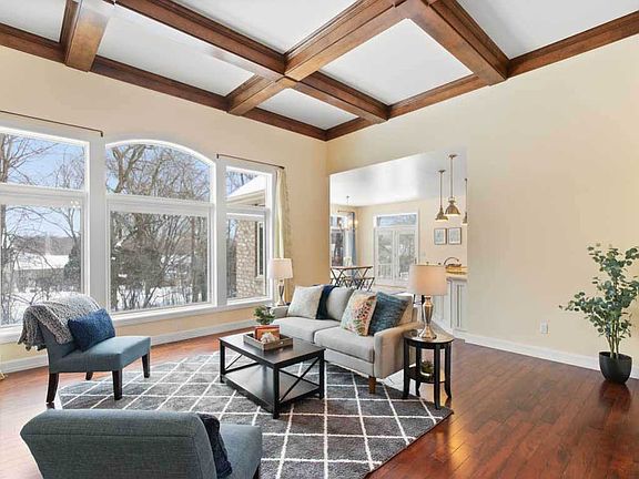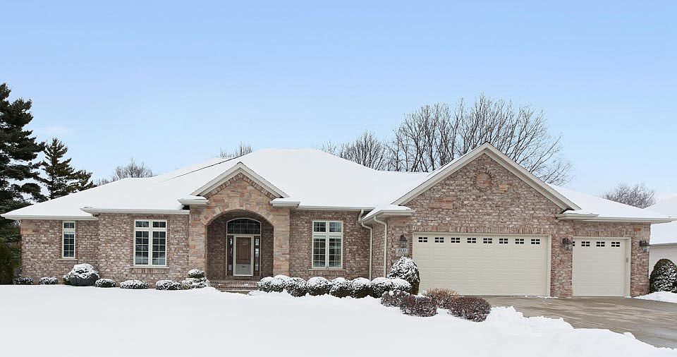 Exceptional all-brick ranch home sits on a wooded lot close to everything SW GB has to offer. Foyer features a round coved inset and leads to the living room w/ coffered ceiling, gas fireplace, built-in shelves, and TV cabinet. Just off the kitchen - w/ pantry, island, and granite counters - is the dining area and outdoor patio. Huge main fl master bedroom with ensuite bathroom and walk-in closet. The 3+ stall garage w/ entry to the laundry and locker area also has basement access. Basement w/ family room, wet bar, 2 bedrooms, bath, and lots of space for storage and another bedroom if desired.