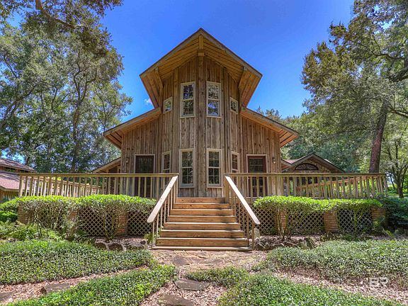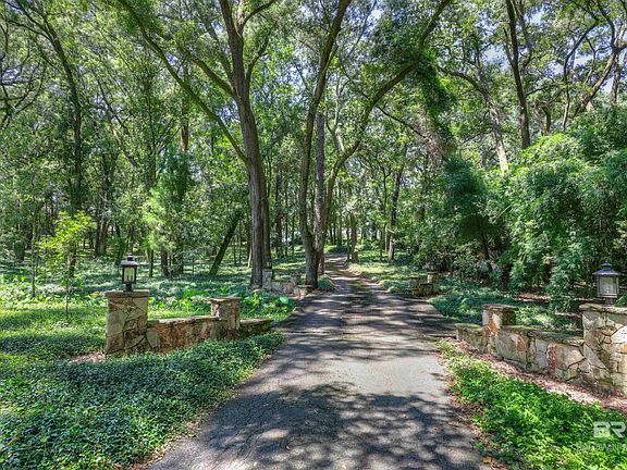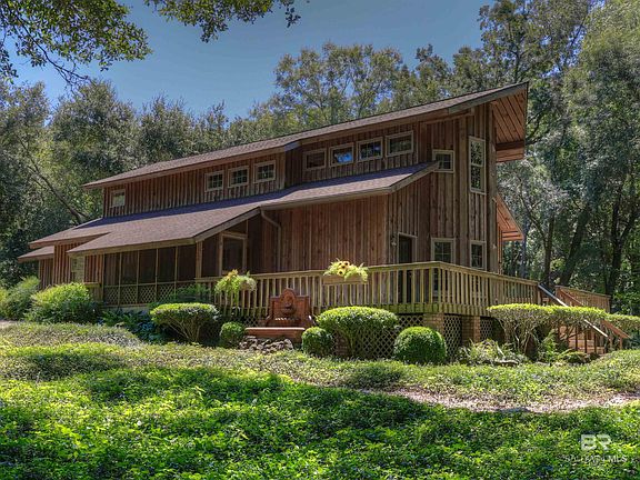 Nestled in the heart of Fairhope, Alabama, this exceptional home offers the perfect mix of secluded charm and suburban convenience. Just minutes from downtown tucked away in a private, picturesque setting of 1.5 acres, this property is a true retreat. A winding driveway lined with majestic oak trees leads to a concrete supported bridge flanked by four lighted stone walls. *** Be sure to watch the virtual tour video to experience this incredible home from every angle. *** Encompassing nearly 3,000 square feet, this home is designed for both comfort and elegance. Step inside, the 22-foot ceiling great room with towering windows that flood the space with natural light. The wide-plank pine flooring complete with a gas fireplace bring warmth and character. A unique kitchen with custom rustic cabinetry, brick floors, stainless appliances and of course a window directly over the sink. This home features three spacious bedrooms and three full bathrooms. Two primary suites, one on the main level and the other upstairs, the third bedroom is on the main floor. Work from home in style! The rich wood-paneled study is an inspiring space, with a see-through fireplace seamlessly connecting to a second livingroom/den. Whether you need a home office or a relaxing reading nook, this space delivers. Outdoor living is just as impressive. With 1,500 sq. ft. of porches and decks, including a side screened porch. The lush, mature lawn requires no mowing, thanks to the beautiful ground cover. The three-bay garage includes a workshop, separate lawn room and the area above (14’ X 24’) offers many different possibilities. A bronze fortified roof for durability and insurance savings and a termite bond for peace of mind. Plus, the charming custom water fountain and dinner bell stay with the home, adding extra character to this already enchanting property. Schedule a tour today and experience the love and care poured into this home. Buyer to verify all information during due diligence.