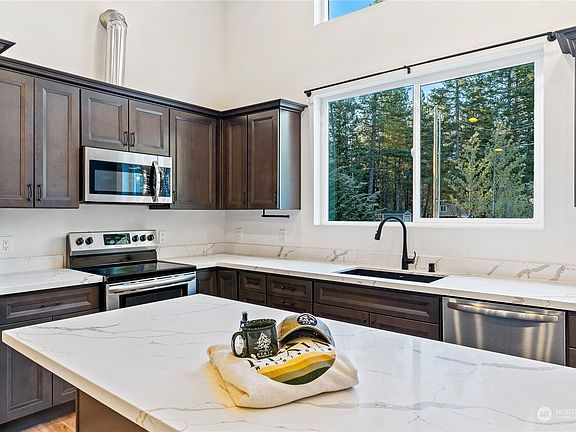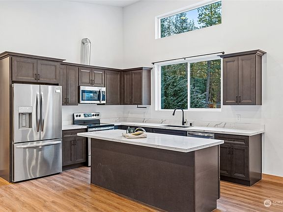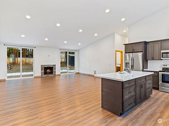 JUST REDUCED - Built in 2022, this Home is ready and waiting for your next adventure near Leavenworth in Plain! Ideal modern layout with great room/open concept kitchen. Skip the dark and dingy - Crafted with vaulted 15 ft ceilings and oversized windows make this home uniquely light and bright. Fireplace lined on both sides with sliders to back deck and cleared level yard. Space for a outbuildings. Just steps across the road to all the Ponderosa community amenities; clubhouse, pool, hot tub, and playgrounds. Ease of ownership with no stairs inside, no carpet and LVP throughout. Ready NOW for SUMMER - year round escape, sun or snow there is always something to do. Just 2 hours from Seattle/Bellevue & 25 minutes north of downtown Leavenworth.