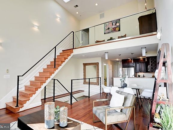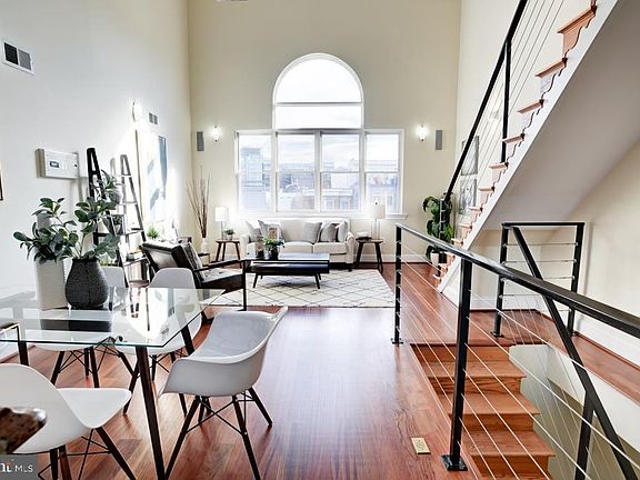 A unique penthouse condo with a great location and soaring ceilings. This property features a two bedrooms two ensuite bathrooms and a half bath. Each bedroom has its own terrace. One bathroom features a large double shower and the other has a skylight, jetted tub double amber glass sinks. Full size front loading washer and dryer is on the main living area. The living space has a 20 foot ceiling with a large windows with an eastern exposure and skylights that fill the space with natural light. There are stainless steel appliances that makes entertaining simple. Thermador range, Jenn-Air refrigerator and Bosch dishwasher and new microwave oven. This is all located just blocks to the U Street, Metro, restaurants and shopping. This also includes a paved off street parking space that is visable from the terrace. Low condo fees and the there are no pet restrictions.