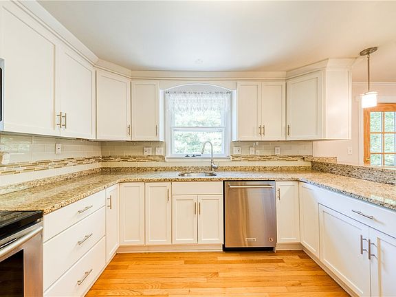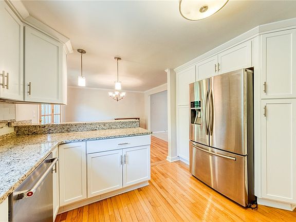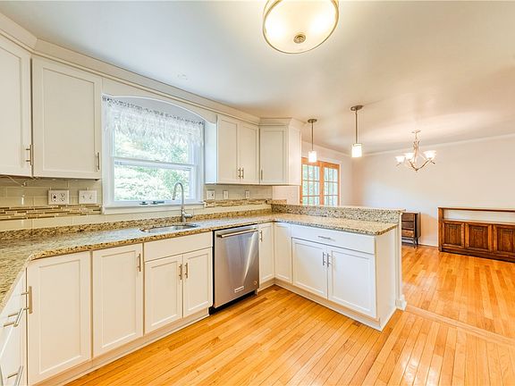 Beautiful no step ranch style home with open concept is a rare find in the Haymaker area of Monroeville. This home features a gorgeous updated kitchen with white cabinetry, granite countertops, stainless steel appliances and modern lighting. The dining room features hardwood flooring and updated lighting, while its French doors open up to the deck outside, perfect for summer gatherings. The spacious living room is carpeted and features vaulted ceilings and neutral paint colors. The large master bedroom features its own en suite bathroom, and there is an additional full bathroom, as well as two more bedrooms on the main floor. The large finished game room/family room measures 26 by 16 feet and features a wood burning fireplace, and opens up to a flat back yard. The basement also includes a two car integral garage, laundry room and workshop area great for many projects. This home's newer mechanics including newer furnace and air conditioning.