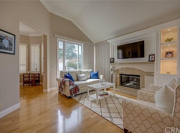 Gorgeous Single Story 2B/2B detached home with Fireplace PLUS Separate Office in Guard-Gated 55+ community of PALMIA. Spacious Kitchen with adjoining Sunny Breakfast Nook Area, as well as Separate Dining Room. Corner lot location provides greater privacy vs. other locations, as well as terrific natural lighting. Fantastic wrap-around rear & side yard areas great for morning coffee, outdoor entertaining, or enjoy gardening in perimeter planting areas. Brand New Dishwasher & Microwave, newer Heater & A/C, Hardwood Floors, Crown Molding, Wide Baseboards, Granite Kitchen Counters, Upgraded Master Shower, Water Softener, Stainless Steel Refrigerator, Remote Controlled Motorized Retractable Awning off Master Bedroom, PLUS Outdoor Motorized Vertical Shade Covers off Dining Room. Direct Access 2-Car Garage with lots of Storage Cabinets. Palmia has countless amenities/activities including 18-hole putting green, Fitness Center, Pool/Spa, Bocce Ball, Shuffleboard, Tennis, Pickle Ball, Paddle Tennis, and BBQ Area. For more relaxing pursuits Palmia has 40+ Clubs & Activities so do as much, or as little, as you like. The main Clubhouse also has a Library, Billiard Room, Card Room, and Meeting Room, as well as a 12,000 sq. ft. Ballroom for Community Events and Parties year-round. Ownership at Palmia also includes member access to Lake Mission Viejo with boating, fishing, summer concerts, and annual fireworks display. HOA Dues include basic Cox Cable.