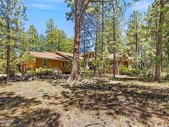 Get out of the heat! Forest Highlands is an exclusive Flagstaff mountain retreat boasting two magnificent clubhouses, a celebrity chef, two premier golf courses, a fitness center, pickleball courts, pools and more. Nestled amongst the pines you will find this private, single level, three bedroom home (2 of which are ensuite) situated on .48 acres including views of the putting green. The spacious kitchen opens to a formal dining room with access to the Trex deck. The great room boasts floor to ceiling windows with views of the pines, a double sided gas fireplace and T & G ceilings! The primary bedroom is spacious with another gas fireplace for cozy winter nights. The primary bath includes a jetted tub, dual sinks and vanity. There are 3 new toilets, central vac, AC, heat tape and more!