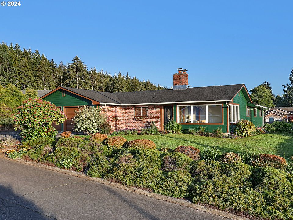 Mid-Century Ocean View Home in the Tranquil Sunset Hills Neighborhood! Nestled on a large lot with mature landscaping, this single-level gem offers an oasis, perfect for relaxation or entertaining. This home features a harmonious blend of classic style and modern updates. Large picture windows infuse the interior with natural light and frame serene ocean views and stunning sunsets. The spacious floor plan includes a generous primary en-suite, two guest bedrooms, a den, and a sunroom. The fenced back patio is ideal for summer gatherings, providing ample space for entertaining. Updates include a newer roof (2018), cement fiberboard siding (2023), and updated bathrooms (2018). All it needs is your personal touch to make this home a perfect 10!