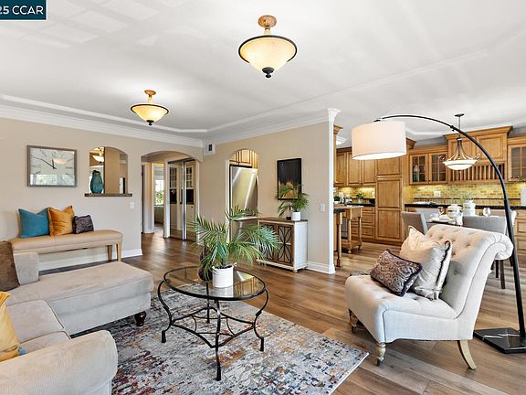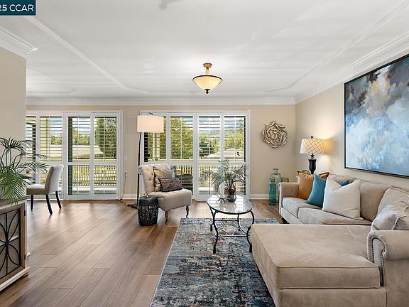 Welcome to a beautiful Sonoma Wrap model in the desirable active-adult community of Rossmoor, situated on 2,000 acres in vibrant Walnut Creek. This lovely two bedroom, one bathroom home has been remodeled from top to bottom and has a rare Bonus Room that makes a perfect Home Office or Den. You'll appreciate the architectural details throughout this coop like the coffered ceilings, arched entryways, and multi-layered crown molding and baseboards. The Kitchen has an abundance of cabinetry and lots of counter space, a moveable island, and a charming dining area. In the spa-quality Bathroom you'll find a stunning shower with built-in seat, designer tile work, and multiple shower heads as well as built-in mirrored cabinets surrounding the vanity. Luxury vinyl flooring throughout gives the property a simple elegance that is easy to maintain. Laundry is a breeze with a dedicated laundry room added to the enclosed wrap. Enjoy our amazing weather from the expansive open balcony overlooking the rolling Rossmoor hills. Don't miss this special end-unit property located in a charming entry with lots of guest parking and its own little neighborhood park.