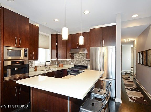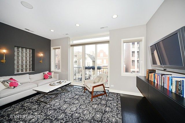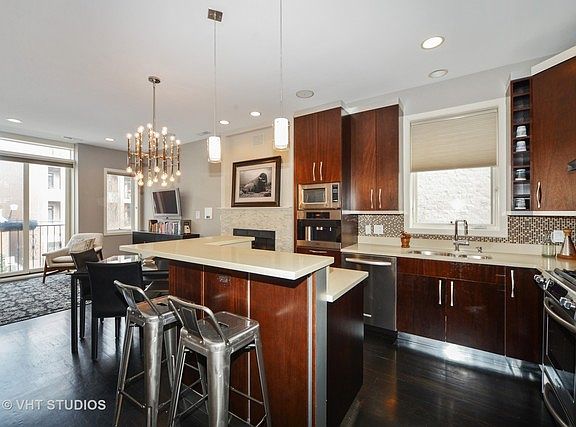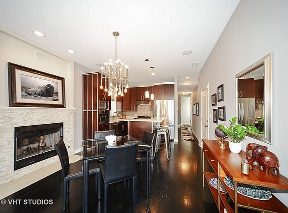 Beautiful 2 bedroom 2 bath condo in all-brick building in Ukrainian Village. Espresso hardwood floors thru-out. Designer kitchen w/flat panel 42" cabinets, quartz counters, glass back splash, stainless steel KitchenAid appliances with vented hood and built in microwave, built-in Miele espresso maker, wine/beverage fridge and a breakfast bar. Spa like master bath has heated floors, large steam shower w/multi sprays, & dual vanity. Wood burning fireplace with gas starter and stone surround. Speakers wired for sound throughout unit. All closets are professional organized and hall closet provides extra storage under stairs. Private deck w/hall access. In-unit washer/dryer. 1 garage spot included plus additional storage. Steps to Marianos, dining, Chicago Avenue bus and Division street.