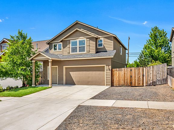 Lovely two-story home on Bend's Eastside, near the Forum shopping center and St Charles Medical Center. Entry foyer leads to the expansive living room, adjoining dining area, both served by an open kitchen that offers plentiful storage and solid surface quartz counters. Adjacent to the main living area is the added convenience of a built-in desk and additional cabinetry storage. Upstairs, the spacious resident suite with en-suite bathroom featuring dual vanity, private water closet, shower and large walk-in closet. Two additional guest bedrooms, each with generous closets, share a private bathroom. Upstairs laundry/utility room affords additional convenience. Attached two-car garage with additional gravel parking adjacent to the driveway and a fully fenced, landscaped yard.