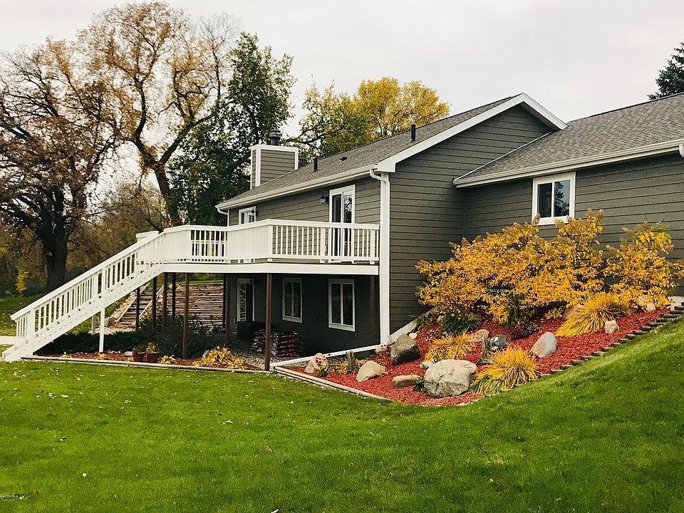 TURN KEY Many new improvements to this well maintained 3 Bedroom, 3 Bathroom rural property with 8.39 acres overlooking Holstad Lake. 2288 sq ft main level living with open floor plan. Home features great functional traffic flow, fireplace, vaulted ceiling, new patio, high end exterior door, and upgrades throughout. Lower level walkout has large family room and bar, and 2 bedrooms and a walkup to garage. Detached finished and heated 24x40' garage. 48x72 pole barn. Horses welcome.