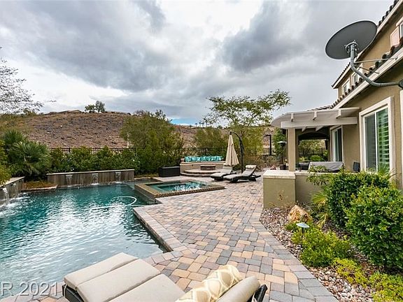 Rare find in highly desirable Inspirada. Featuring a designer backyard on an oversized lot with privacy to enjoy the luxurious salt water pool, pebble tec, slate waterfalls & vanishing edge spa, surrounded by luscious greenery with dozens of white rose to add to the beauty. Built in BBQ, gas fire pit & covered patio with TV, perfect for game day! HUGE side yard with turf & plenty of room to play with gorgeous views backing up to the community trail. If that isn't enough, you are a short distance to several parks with lots of fun including resident only pool, playgrounds, skate park, dog park, basketball & tennis courts + access to Toll Brother's exclusive pool & gym. Open concept with a Guest Suite located downstairs to include a bedroom, den & 3/4 bathroom. All bedrooms upstairs are very spacious, separate from one another, plus a large loft. 3 car garage includes epoxy floors, tankless water heater and soft water system. Outdoor furniture & TV will remain with property.