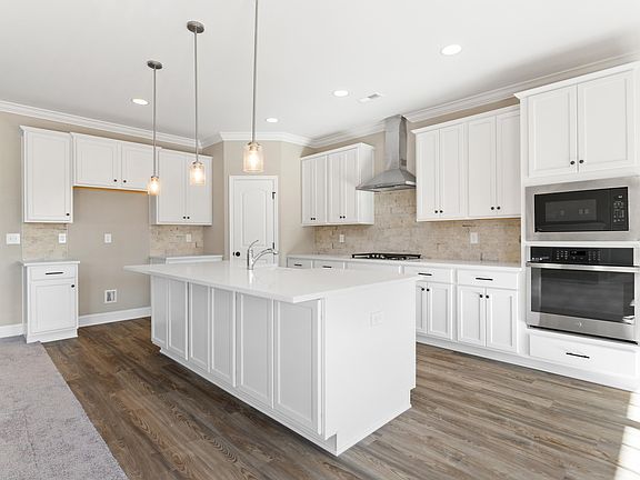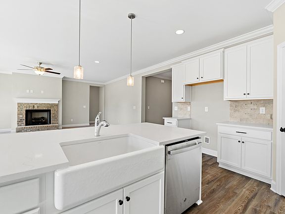 Move-In-Ready! Discover the Harrison B floor plan featuring a grand arch entryway that welcomes you into an impressive foyer and gallery. This home boasts a deluxe built-in appliance package, including a 5-burner gas cooktop and farmhouse sink, complemented by painted cabinets and stunning quartz countertops. Enjoy the warmth of LVP flooring and a natural gas brick fireplace with a raised hearth. Additional highlights include crown molding throughout, a natural gas tankless hot water heater, and a gas furnace. With a 3-car garage, gutters, window screens, and community amenities like street lights, sidewalks, and a serene pond, this home is a true gem!
