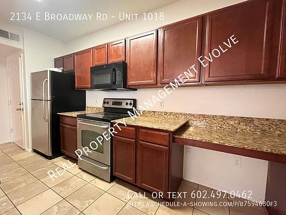 This second-floor, 3-bed, 2-bath condo in Tempe is move-in ready! Tile and wood floors, and ceiling fans throughout. Kitchen features a breakfast bar, plenty of cabinet-space, granite counters, and all appliances are included. Primary bedroom has ensuite bathroom and a large walk-in closet. In-suite laundry space with washer and dryer included. Attached 1-car garage and a private patio. Great community amenities include a sparkling pool, spa, and fitness center. Schedule a tour! *Pets accepted with applicable pet deposits and fees. Community Pool Dryer Garage Gated Community Oven/Range Washer