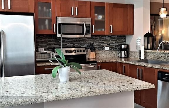 Sophisticated 3 BR, 3 1/2 BA + den w/attached private 2 car garage. Light & bright 3-story town home with 10 foot ceilings provides ample space for entertaining family and guests. Two balconies with garden and pool view flanked by palm trees. Sleek open kitchen w/stainless appliances, granite counters, and tons of cabinet storage. Ceramic floors; Berber carpeted stairs & bedrooms, two breakfast bars, washer, dryer, high impact glass windows & sliding doors. Has 1 year transferable appliance warranty until July 2021. Best Location in the community. Pool and Courtyard View. Walk to downtown Hollywood restaurants and bars, or bike to the beach. Short drive to Hollywood Beach, Hard Rock Hotel & Casino and Ft Lauderdale Airport. Pets allowed. May be leased immediately for up to $3,000 monthly