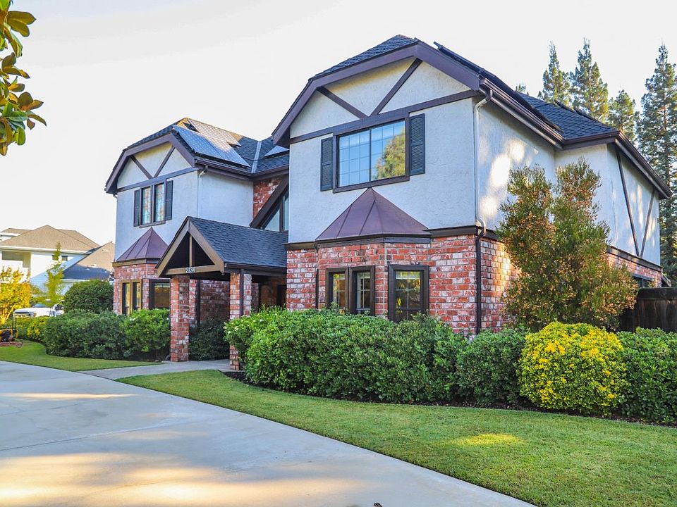 Enough space to host hundreds, or just come home and relax! This nearly 3/4 acre estate is in the private Bluff Gate community just East of Van Ness extension in Northwest Fresno. The versatile floor plan features a huge dining room, open to the family room with soaring ceilings, stone-faced gas linear fireplace, and wall of windows to the South lawn, affording lots of natural light. The updated kitchen boasts leathered granite countertops, walk-in pantry, Wolf 6-burner gas range with grill, GE Monogram fridge and dishwasher, custom island, and a sunny breakfast nook. Two additional living spaces include the front home office and a den off the 4th bedroom and bath. A convenient laundry room completes the lower level of the main house. The gorgeous sweeping staircase off the entry leads to a generous primary bedroom retreat with its vaulted ceiling, spacious reading area, free-standing bathtub, and balcony overlooking the backyard. On the upper South wing are two large bedrooms and a full bathroom. PLUS, there is a guest house that has a full kitchen with pantry, living room, bedroom, laundry room, and 1.5 baths. The backyard is an oasis with an outdoor kitchen, sparkling pool, and enormous lawn area. Total of 5 garage spaces (3 attached to main house, and 2 attached to the guest house) and plentiful off-street parking for your guests. Solar lease has been prepaid in full!