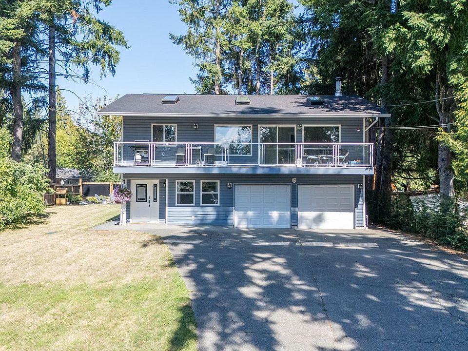 Welcome to this 3 bedroom, 3 bathroom home located in the quiet community of Cedar. Situated on a level, fenced .26-acre lot, this property offers privacy and plenty of usable outdoor space. The main level features an open-concept layout where the kitchen connects to the dining and living areas, with direct access to the front deck. Two bedrooms are located on this floor, each with its own ensuite bathroom, providing comfort and convenience. One of which has access to the back deck with stairs down to the backyard. The lower level includes an additional bedroom, a 3-piece bathroom, the laundry room, and an oversized two-car garage with lots of space for storage or hobbies. Outside, the yard is designed for enjoyment with a custom fire pit, and raised garden beds. This home has seen numerous updates including new laminate flooring, updated baseboards throughout, a heat pump, and a wood stove for winter evenings. (Measurements and data approximate; verify if important.)