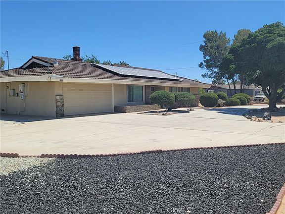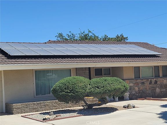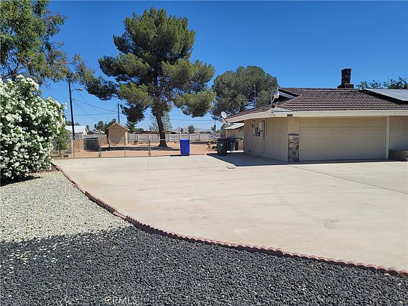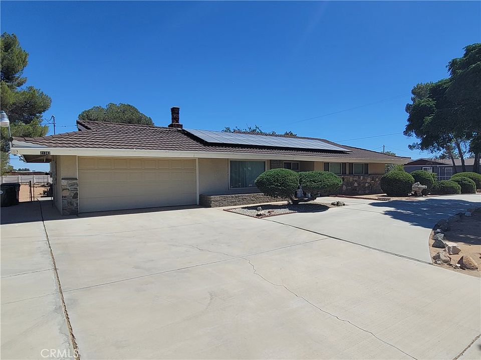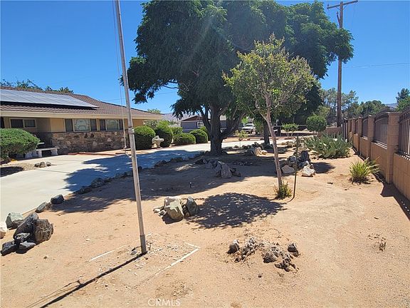 This one of A kind house Located in the city of Apple valley close to parks schools and shopping. The house is fully fenced with Rod iron and brick wall for privacy has A nice circular drive way with lots of concrete on the side to park A RV or for additional car parking. The front yard has beautiful landscaping and lots of mature trees. The floor plan is very open when you walk inside there is very nice size living room with A wood burning stove, Nice dining room area as well. The kitchen is very open and has lots of cabinets space. The cabinets in the kitchen are newer. There is Two large bedrooms with nice size closets that share A bathroom with A nice size tub. The master suite bedroom is very spacious and has a newly remolded bathroom and has large closets. The home also features A newer Air conditioner and Heating unit. The back yard has horse stables and three nice side sheds that will stay with the property. There is A nice grass area and also with A lot of mature trees. The back yard is also fully fenced. This home comes with paid off solar panels