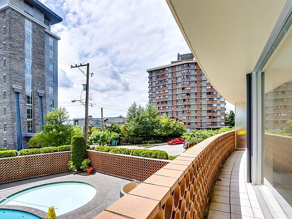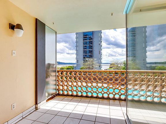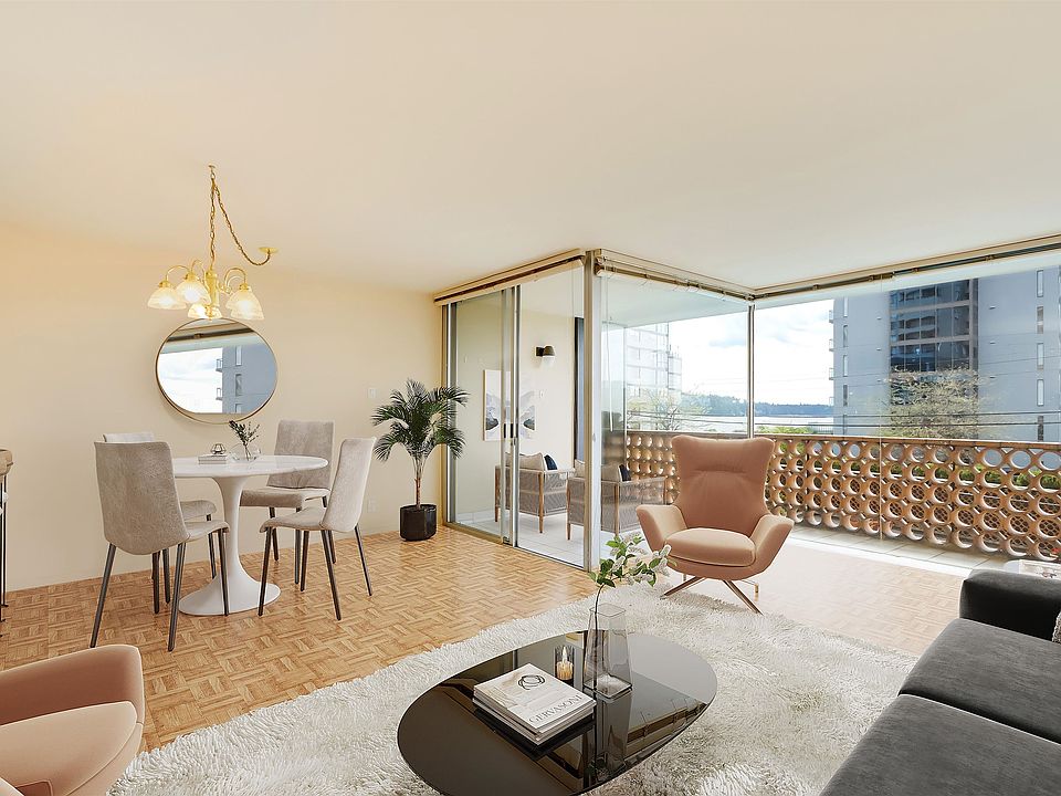 OCEAN VIEWS at 'The Crescent' - semi waterfront gem! This oversized 1 bedroom home is a rarely available blank canvas ready for your design ideas. Featuring floor to ceiling windows you can bask in the views from every room or relax on your covered balcony overlooking the pool and garden area. Located just steps to the seawall, shops, library, Seniors/ Aquatic/Rec center and much more. Well kept building with great community. 1 parking and 1 storage, Age Res. 16+