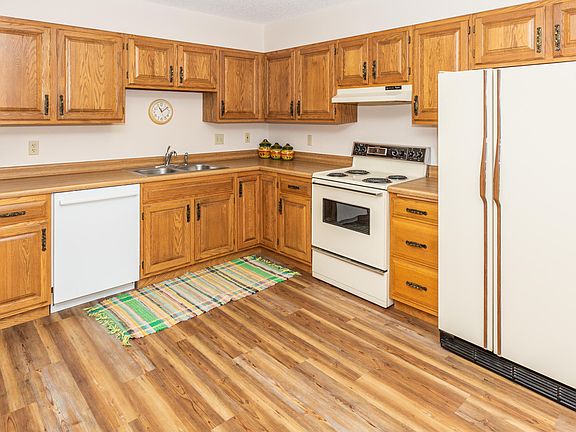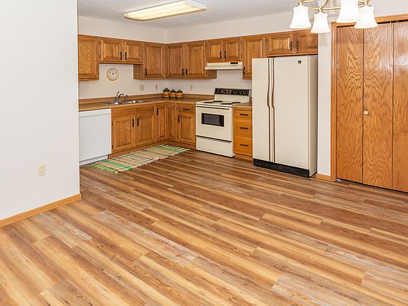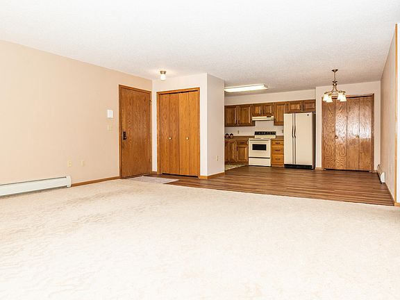 Looking for easy living with no snow removal or lawn care?! This 2 bedroom, 2 bath condo is in a security 55+ building with an elevator. The condo is located on the second floor and has an east facing balcony allowing for lots of morning sun. There is a large kitchen open to the dining and living rooms and features a newer dishwasher. There is new vinyl plank flooring just installed in the kitchen and dining. There is a large pantry closet for storage. The home offers two nice sized bedrooms. There is a full bath plus a laundry and 1/2 bath combo. Both bathrooms recently had new flooring installed and were painted. This unit offers 2 GARAGE STALLS located just across from the back door! The condo building has a newer elevator, a community room to gather with friends, newer steel siding, windows, shingles, boiler and water heater. This is a no pets/no smoking association. The condo fee of $175 covers all the utilities except electricity plus snow removal and lawn care, and exterior insurance. The large parking lot in the back allows for easy access for guests and the association allows summer RV parking, ideal for snowbirds!