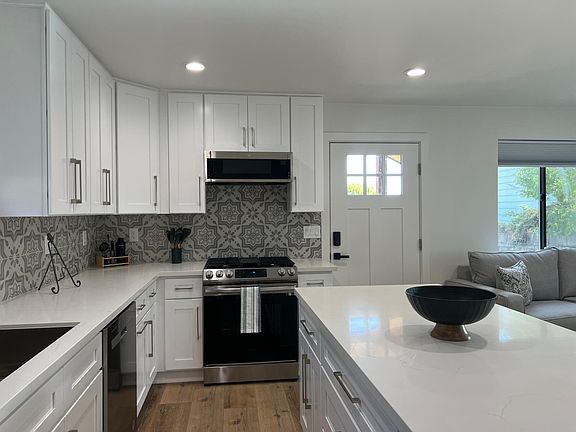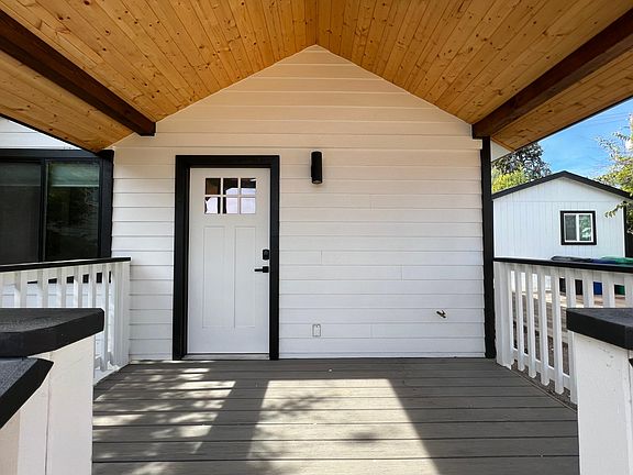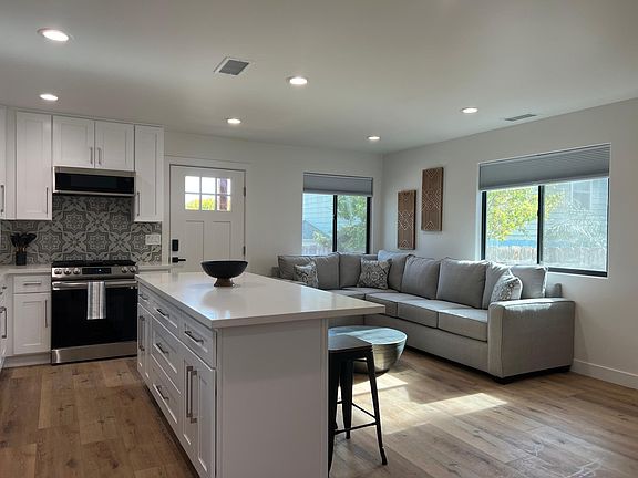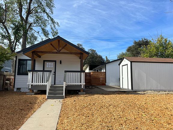 Charming Furnished Cottage just blocks from Downtown Paso Robles and walking distance to Paso Marketwalk and grocery store. This home is like brand new as it has been remodeled from top to bottom including a new roof, heating/air, quartz counters in the kitchen and bathrooms, all new cabinetry throughout, luxury vinyl plank flooring, and LED lighting. The spacious kitchen is open to the living room and has a large island with 4 barstools for seating. The stainless steel appliances are brand new and include a gas stove, microwave and dishwasher. The living room has plenty of natural light, a cozy sectional, and large wall mounted TV. Both bedrooms have closets and there are 2 full bathrooms plus laundry in the hallway. The guest bathroom has a brand new tub and stylish tiled shower. The primary suite offers an attached en suite bathroom with dual sinks and mirrors, plenty of cabinets, and a large brand new shower with rain showerhead. Outside you will enjoy a covered front porch overlooking a large front yard that sits up above the street away offering privacy. There is also a detached shed for storage and concrete patio. Trash cans shared with studio tenant.