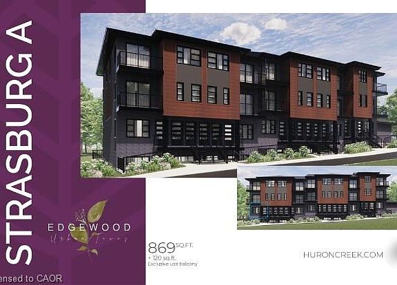 Welcome to the Strasburg A - A stunning 2-bedroom, 2-bathroom ground level unit in a stacked townhome-style condo, perfectly blending urban convenience with natural tranquility. Tucked into the serene Brigadoon Woods, this thoughtfully designed home offers a spacious open-concept layout ideal for both relaxing and entertaining. Step inside to discover generous-sized bedrooms, including a primary suite with ample closet space. The balcony extends your living space outdoors, offering a peaceful retreat surrounded by mature trees and greenery. Enjoy the best of both worlds — nature at your doorstep and all amenities within easy reach. Located close to top-rated schools, shopping, dining, and with quick access to major highways, this home offers exceptional lifestyle and value. Whether you're a first-time buyer, downsizer, or investor, this beautifully maintained condo is a rare opportunity in a sought-after community. Don't miss it! PLEASE VISIT - (((Sales Centre is located at 35 Trillium Drive, Unit 1 in Huron Creek Developments building - lower level )))