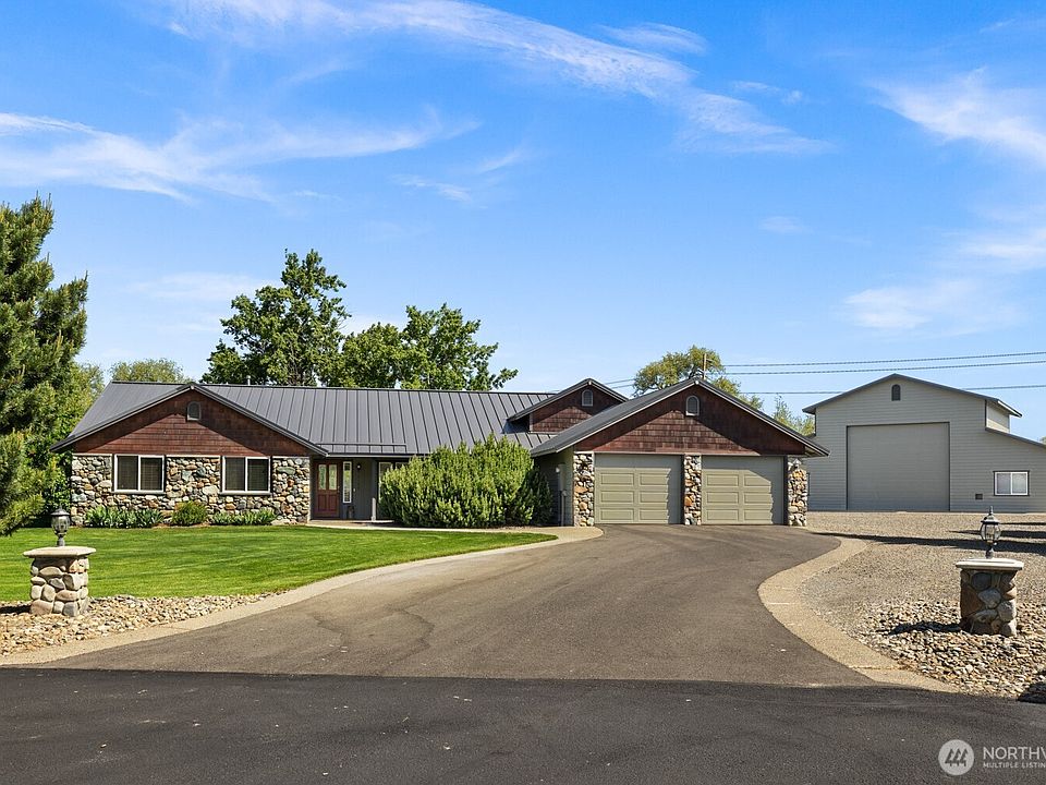 Don’t miss this beautifully maintained 3 bedroom, 2 bath home on 2 acres! This bright, cozy, and functional home has an open floor plan that makes entertaining a breeze. You are greeted with a large great room that flows right into the recently remodeled kitchen. Along with a gas forced air system, there is a newer efficient gas fireplace will keep you extra warm in the winter months, and a/c will keep you cool in summer. New (2024) metal roof on home and shop. Plenty of storage with a giant 3 car garage and a huge shop! The shop is insulated, heated and has an air compressor. The property also features an adorable chicken coop in the pasture. Close to freeways and town, with the John Wayne Trail in your backyard.