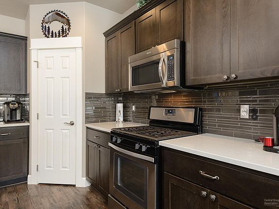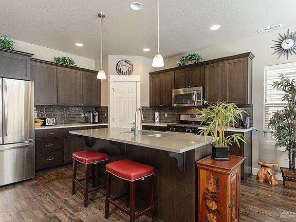 Pride of ownership in NE Bend! Open floor plan featuring hardwood, tile, solid surfaces, rock fireplace, zoned HVAC and stainless appliances. Back yard is low maintenance featuring colored concrete, stone walks and shed with custom interior finish. Community has swimming pool, park and walking paths. HOA maintains front yard, common area and pool.