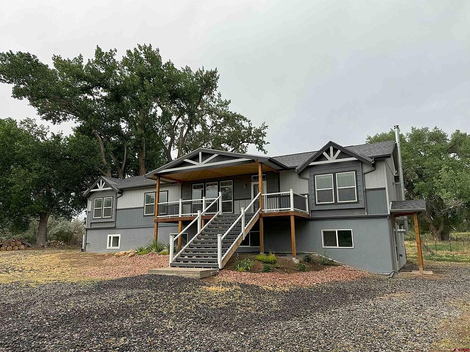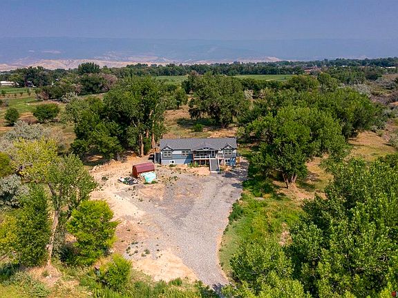 MOTIVATED SELLER! Situated in a stunning country setting with rolling landscapes and Grand Mesa views, this home has two separate living quarters! Enter the main level of the home from the covered front porch. A touch of elegance greets you in the spacious living room with tray ceilings, crown molding, and recessed lighting. The upper floor is an open concept with the living room flowing into the kitchen and dining area, making this home perfect for entertaining. A cozy family room is adjacent to the dining area and has a free-standing fireplace offering the warmth and relaxation only a fireplace can. The kitchen boasts modern elegance with a large island, cabinetry that reaches the ceiling, and continued crown molding. Off the dining area are glass sliding doors which take you to a back deck that overlooks a large garden area and potential backyard. Split floor plan with a spacious master bedroom. The ensuite master bath has a glassed-in shower and a separate soaker tub with excellent country views to be enjoyed while relaxing in the bath. No doubt there is a roomy walk-in closet in this master. Two nice sized bedrooms on the main floor also have walk-in closets! A full guest bath with a double vanity is also located on the main floor. The additional living quarters on the basement level have their own outside entrance. Great for extended family or rent out this area for additional income! The living area in this basement level also has a free-standing fireplace. The additional full kitchen has ample cabinetry and even has a dishwasher. Three additional bedrooms are located on this level along with a full bathroom, again with a double vanity. Another laundry room offers complete amenities for guests/renters. The property has mature trees throughout offering a picturesque landscape to walk and explore with exceptional gold/yellow colors in the fall. Alfalfa Run is a natural drainage that flows through the property and there are 3 stocked ponds to enjoy! With no HOA or covenants, this acreage has so much potential from pasturing horses to building your perfect garage or shop. Irrigation water includes 15 shares of Butte Ditch, and several acres are irrigated with gated pipe. Do not miss out on this gem.