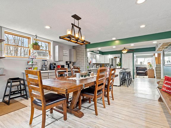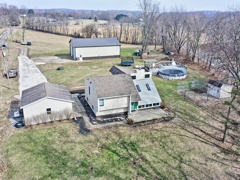 This stunning 2,500 sq ft bi-level consists of 5 bedrooms, 2.1 baths and a loft/office. It's situated on a hill with beautiful views! Updates and amenities include; a spacious Kitchen with beautiful cabinets, stainless steel appliances, corian counter tops and island, a cozy family room that boasts a stone wood burning fireplace, a loft that can be used for an office, rec room or den. The Owner's suite has vaulted ceilings and dual walk in closets. Outside the home you'll discover a 40x56 garage (2019) with concrete, electric, drains in the floor, 16' ceiling with (2) 14'Hx16'W overhead doors. There's also a 24x24 detached garage by the house, a 24' above ground pool with large deck, large back patio with retaining wall, front deck, chicken coop and small dog kennel! 35 min to New Albany
