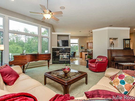 Stunning executive ranch with sweeping pond frontage in the coveted Van Singel Farms Community. Custom-built gem features soaring ceilings, walls of windows, beautiful architectural details. This 4,300 sf, 4 bedroom/3 full bath home has stunning design features and a modern look with top quality materials and craftsmanship. Open floor plan is great for entertaining and family living. Main level hosts impressive master suite with sitting area & spacious walk-in closet. Gourmet kitchen w/ expansive granite island, Brazilian cherry hardwood flooring and walk-in pantry. Great room with 2-sided fireplace and dining area open to a generous no maintenance deck to enjoy the amazing views and nature. Main level also includes laundry room, formal dining room and a second bedroom suite. Walk-out level adds 2 large bedrooms, full bath, home theatre seating and equipment included, large recreation/family room and wet bar. New air conditioner. Conveniently located near M6, 131 and local hospita