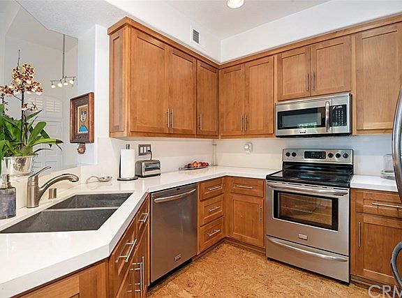 This private & serene detached home is located in the highly desirable guard-gated 55+ community of Palmia. This 1,325 sqft custom single-level floor plan includes 2 bedrooms plus a permitted sunroom/den/office! Enter the home from a gated courtyard on a quiet cul-de-sac. You're greeted by vaulted ceilings, a living room filled w/ sunlight, & luxurious cork flooring throughout. The kitchen's stainless steel Frigidaire Gallery series appliances, Caesarstone counter tops, bar seating, & openness to the dining area makes this home ideal for entertaining. The master bedroom includes a newly remodeled step-in pebble shower, separate water closet, dual sinks, & a sizable walk-in closet. Additional upgrades include new ceiling fans w/ lights, vinyl windows, new cabinetry throughout, plantation shutters, hallway built-in cabinets for extra storage, air conditioning, & newer sprinkler system. Relax all day on your pergola-shaded wraparound patio w/ no neighbor behind. This coveted address awards you w/ the gold standard of retirement living: Tennis Courts, 18-hole Putting Course, Paddle Tennis, Olympic-Size Heated Pool, Spa, Gym, Bocce Ball, Shuffleboard, Party Bridge, Duplicate, Ballroom/Theater, Table Tennis, Billiard Room, Card Room, Library, a 4-minute walk to the Clubhouse, Outdoor Olympic Size Heated Pool, & Sport Activities. Join numerous clubs for many interests including Acting, Wine Tasting, Opera, & Travel. No Mello Roos! This is your opportunity to own this masterpiece.